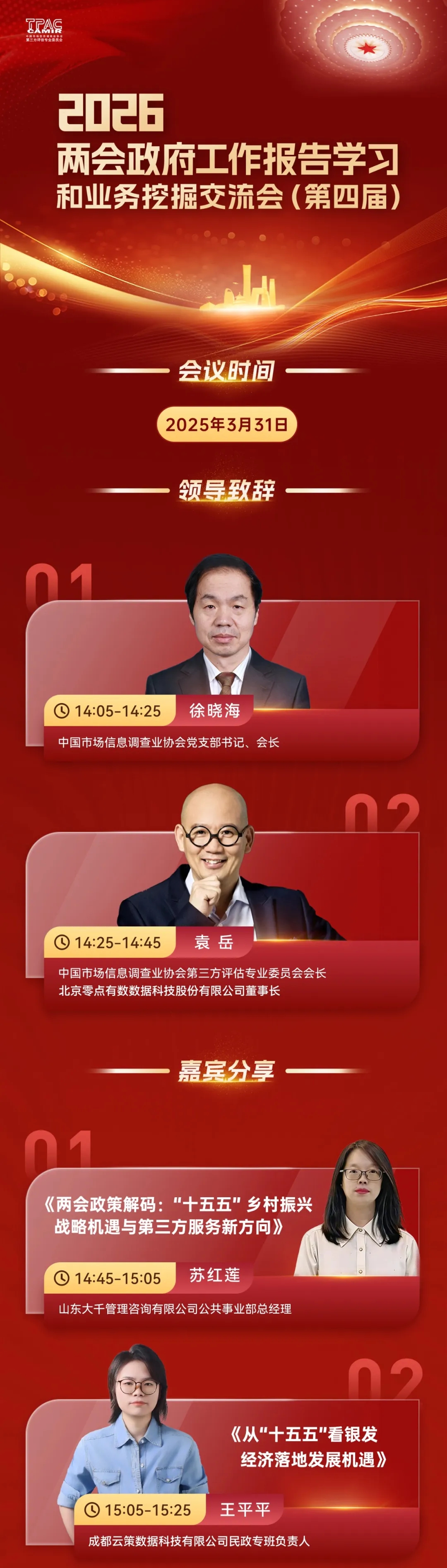 为了紧跟2026年全国两会部署,围绕“十五五”发展重点,发挥第三方评估在数据洞察与市场研判中的专业价值,助力行业提质增效。中国市场信息调查业协会第三方评估专业委员会将于3月31日(星期二)召开“2026年两会政府工作报告学习和业务挖掘交流会”。会议将邀请行业专家围绕政府工作报告与“十五五”规划,分析行业发展机遇;组织会员单位交流研讨,聚焦政策新动向,探索行业新趋势。会议具体议程安排如下: